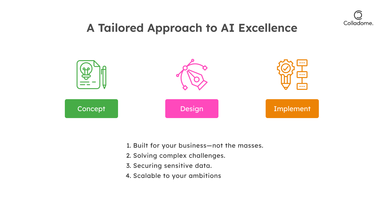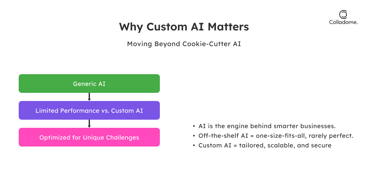 Are you tired of working with generic AI that barely scratches the surface of what you need? Let’s create something extraordinary. Custom AI isn’t just a tool; it’s the blueprint for your success. At Colladome, we build AI solutions that grow with your business, giving you the edge over competitors who are still stuck with off-the-shelf tools.