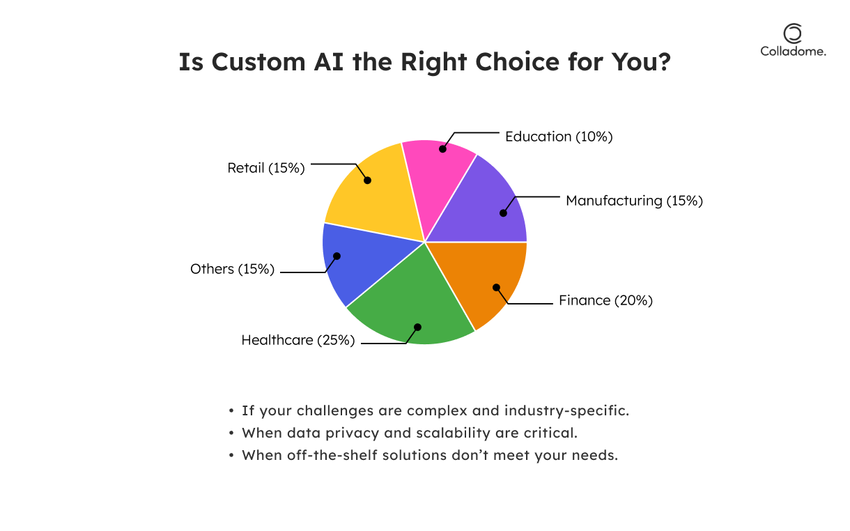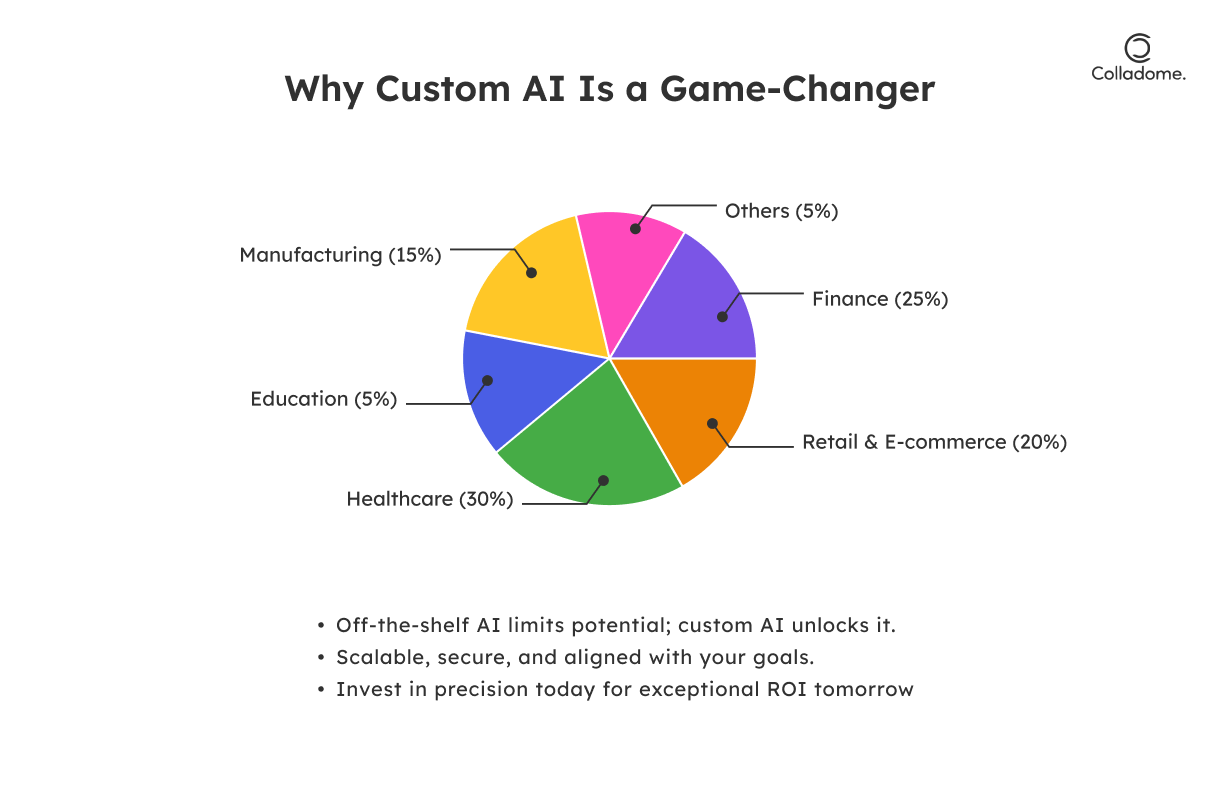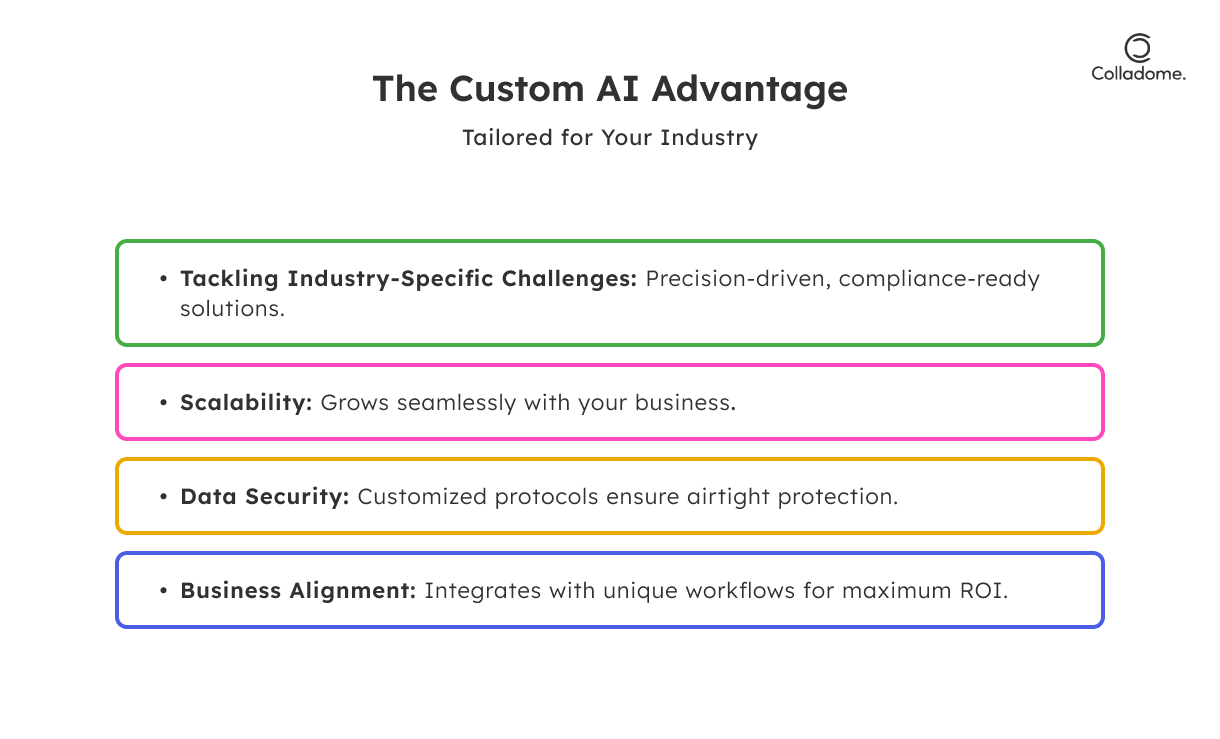 - Custom AI is built with your industry’s nuances in mind. Whether it’s navigating HIPAA compliance in healthcare or automating precision-driven manufacturing tasks, tailored AI delivers the exact solutions your business demands.
