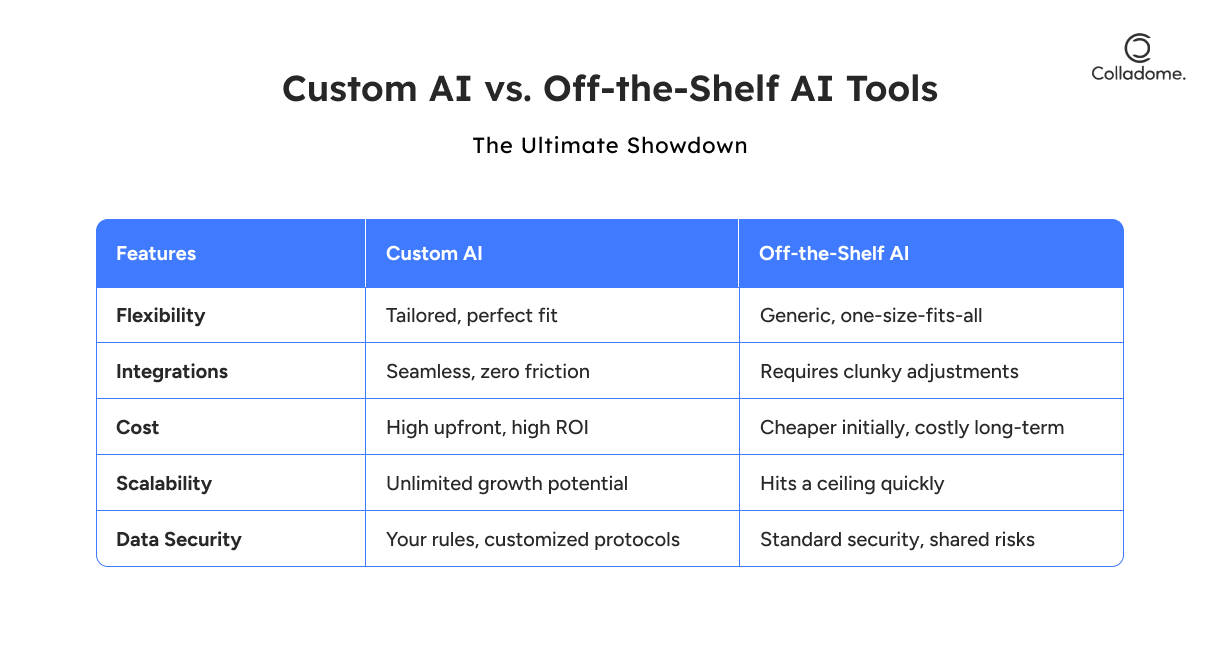 Let’s settle the score: Custom AI vs. Off-the-Shelf AI Tools. One’s your tailored power suit, and the other’s a last-minute buy off the rack. Ready to see who wins?