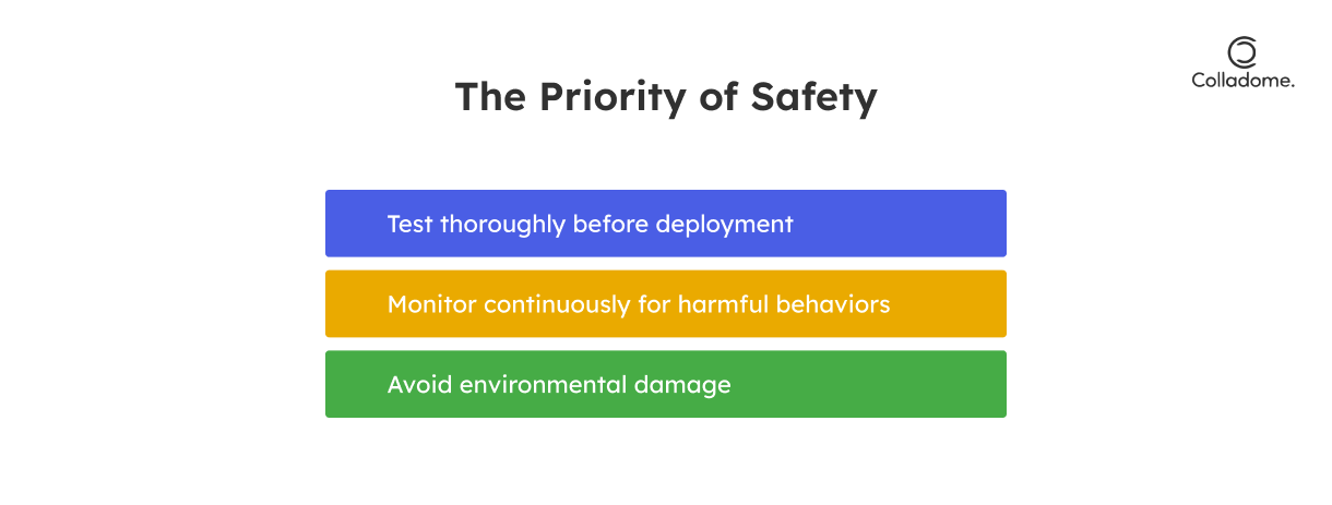 - Lastly, safety—AI should not cause harm. Whether it’s in the form of physical harm (think self-driving cars) or environmental impact, ensuring AI doesn’t hurt anyone is a top priority.